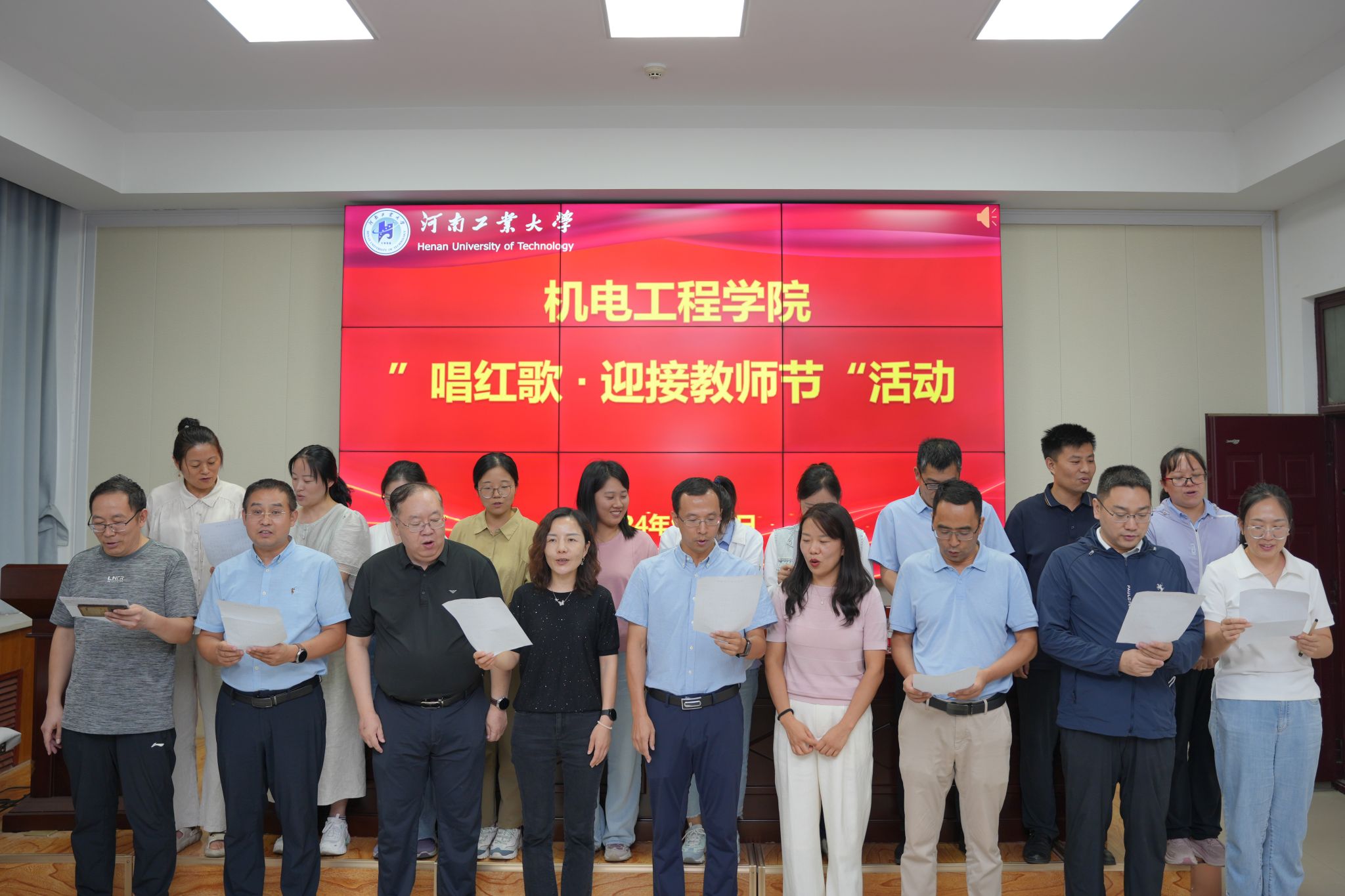 为进一步加强教师队伍建设,弘扬广大教工爱党爱国、立德树人的精神风貌,学院举行了“唱红歌,迎接教师节”主题活动,院行政、机械工程系、智能制造工程系、粮油工程及装备系、工程图学系、车辆工程系、机械设计系和材料成型及控制工程系依次登台合唱《吃瓜91