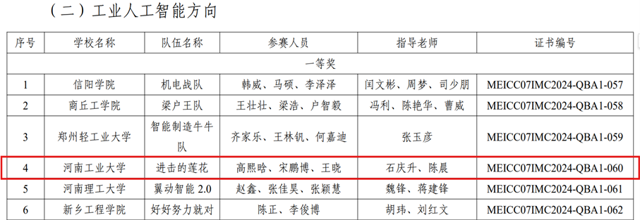 本科生高熙晗、宋鹏博、王晓组成的“进击的莲花”团队,在石庆升、陈晨两位教师的指导下,凭借优异表现荣获本科组工业人工智能方向河南省一等奖。