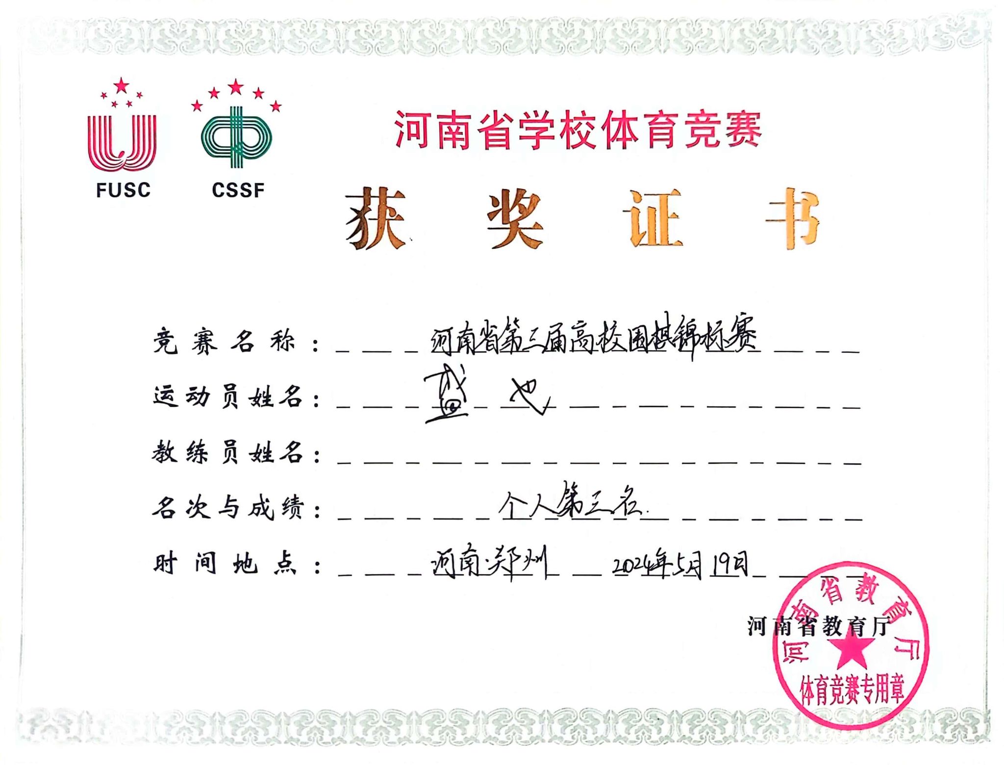 5月18日至19日,河南省第三届高校围棋锦标赛在河南郑州如期举行。经过两天七轮的紧张而激烈的角逐,吃瓜91 盛也沉着应对、睿智思考、落子无悔,最终荣获学生组个人季军的好成绩。