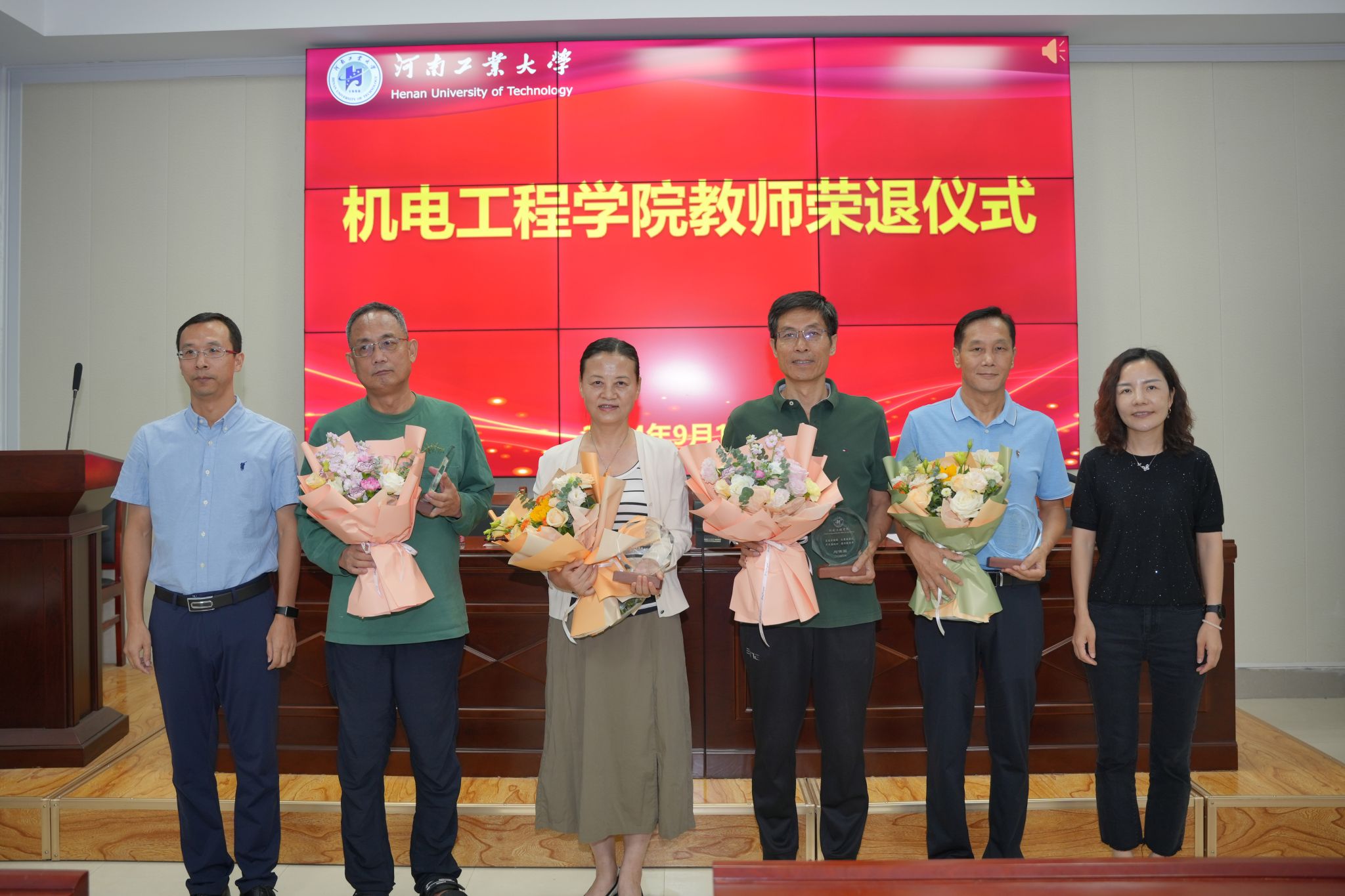 为切实增强退休教师的荣誉感和归属感,传承前辈教师的爱岗敬业精神,学院为沙杰、马晓录、吕俊智、刘保国4位教师举办了荣退仪式,院长吴兰代表学院向4位教师为学院的发展做出的突出贡献表示感谢,希望各位老师向他们学习,热爱教育事业,薪火相传,为学院的发展积极奉献自己的力量。魏涛、吴兰代表学院分别为4位老师献上荣誉奖盘和鲜花,并合影留恋。