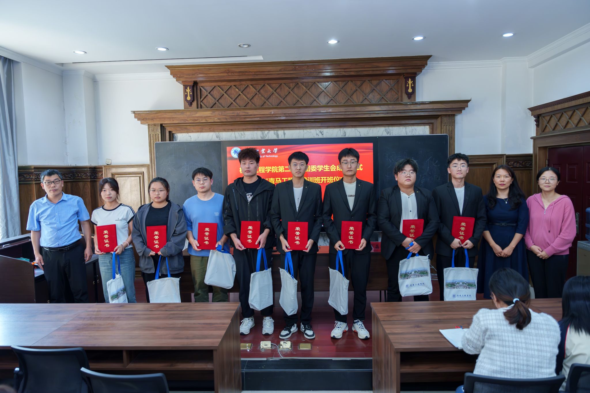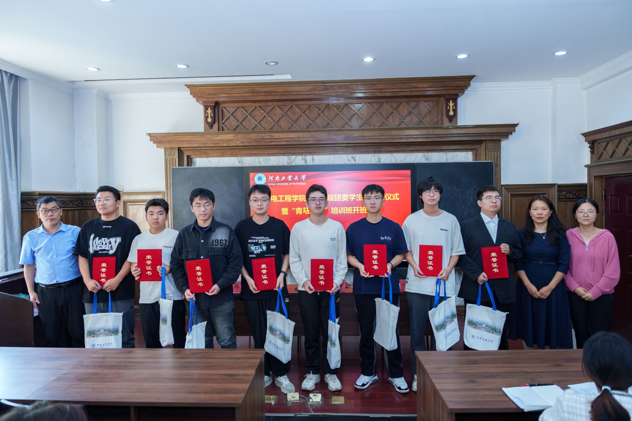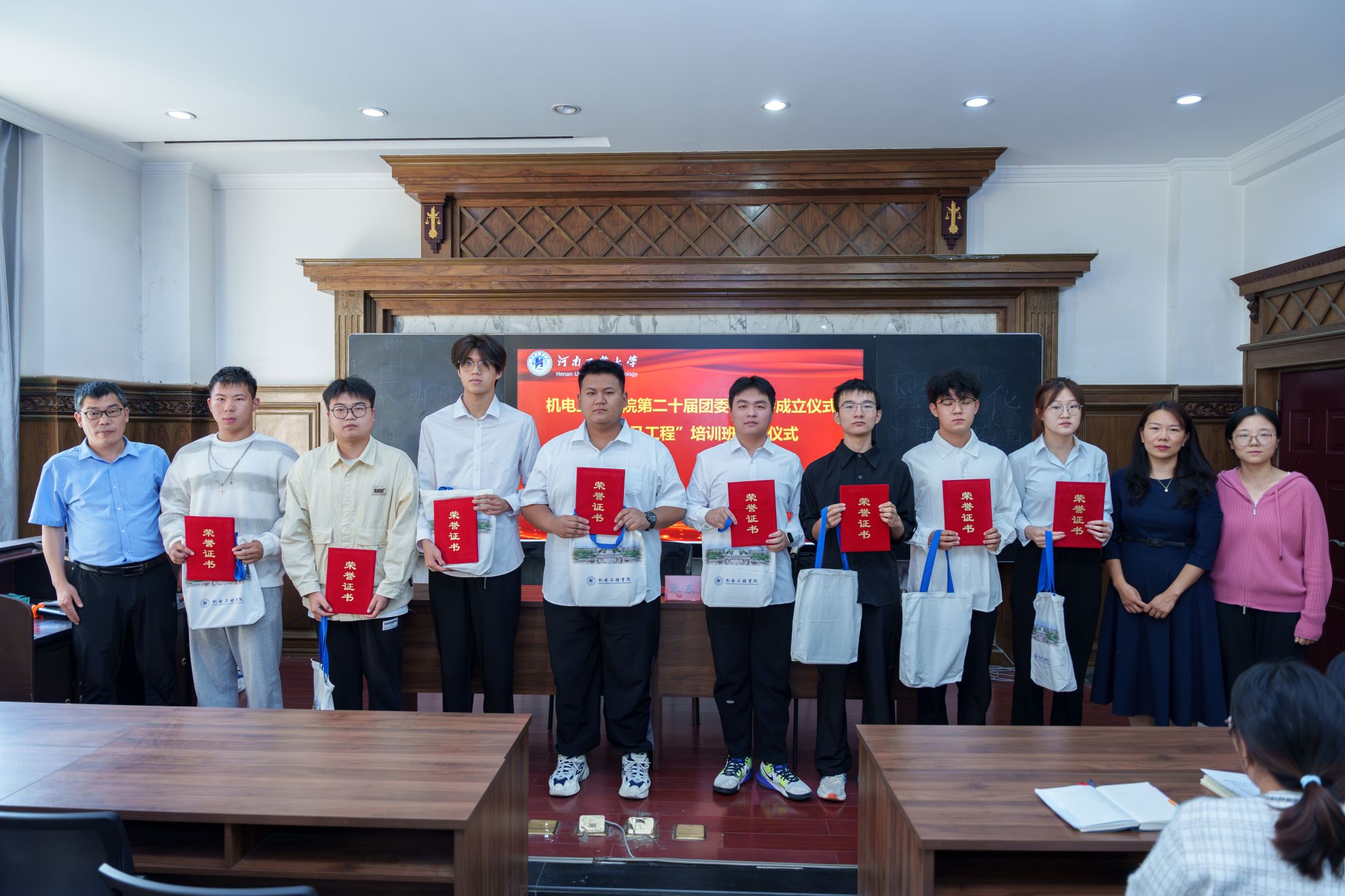 丁晶晶宣读了第十九届团委学生会表彰名单及第二十届团委学生会聘任名单。全体辅导员老师为受表彰同学颁发荣誉证书、纪念品并合影留念。