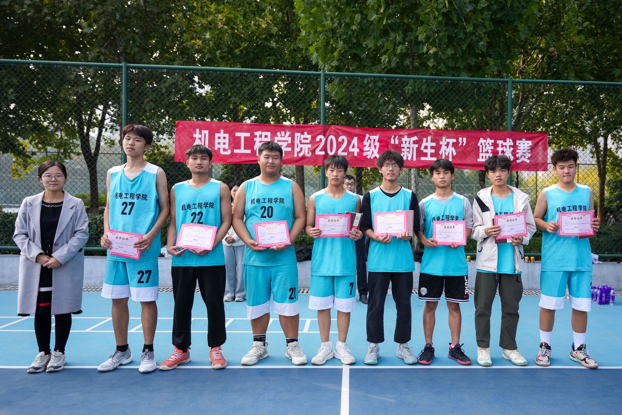 经过激烈的角逐,机制2403、2404代表队夺得冠军;机制2401、2402代表队荣获亚军;材控2401、2402代表队获得季军;机制2404班任亚豪同学获得全场最佳球员。学院老师为同学们颁发了奖杯,并合影留念。