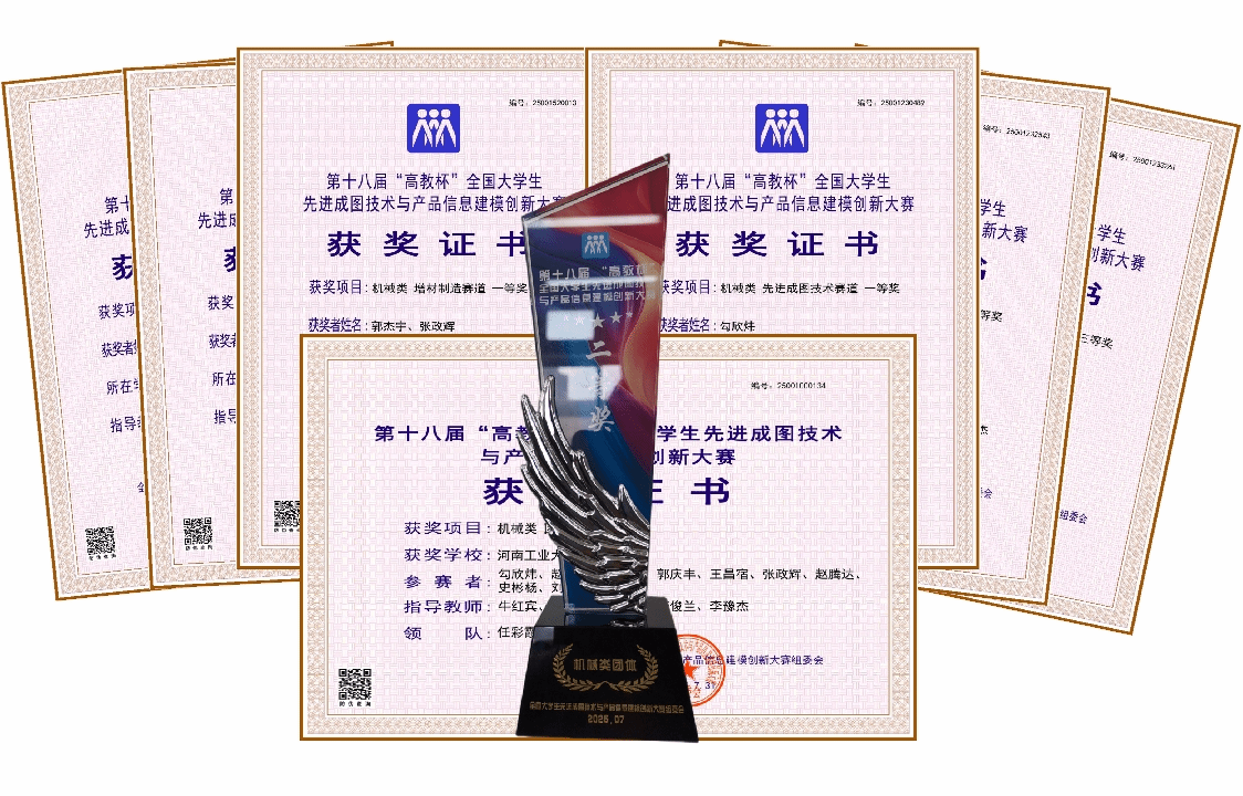参赛学生在牛红宾、任彩霞等老师的悉心指导下,最终获得全国机械类先进成图技术赛道一等奖1项、二等奖1项、三等奖3项,同时获得机械类增材制造赛道一等奖1项、机械类团体二等奖。