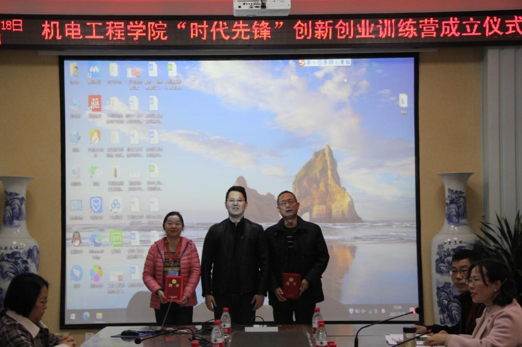 “时代先锋”创新创业训练营的通知》。杨子江为创新创业训练营特聘导师沙杰、王伟老师颁发了聘书。